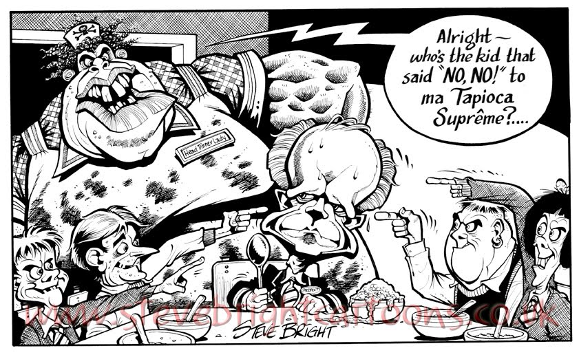 This was one of the most enjoyable commissions of my career so far. When Nick Moore from Dr Burnorium's Hot Sauce Emporium initially asked me to envisage the character to front his business, I came up with the above sketch to hopefully satisfy his search for a malevolent travelling salesman type. I always have enjoyed the opportunity to draw malevolence, having been largely (though not completely) denied it throughout my career in children's comics, so I was very keen to have a go at it. However, from experience, I'm always aware that what the client asks for and what they actually want are not necessarily the same thing, and so I tend to hold back on drawing anything to extremes for a first draft.